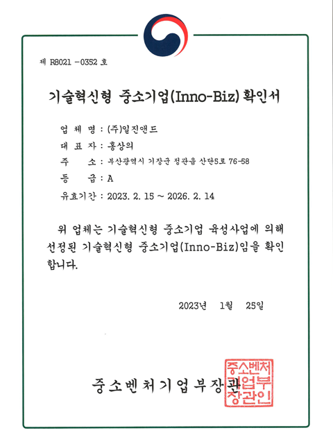 우량기술기업 인증서
